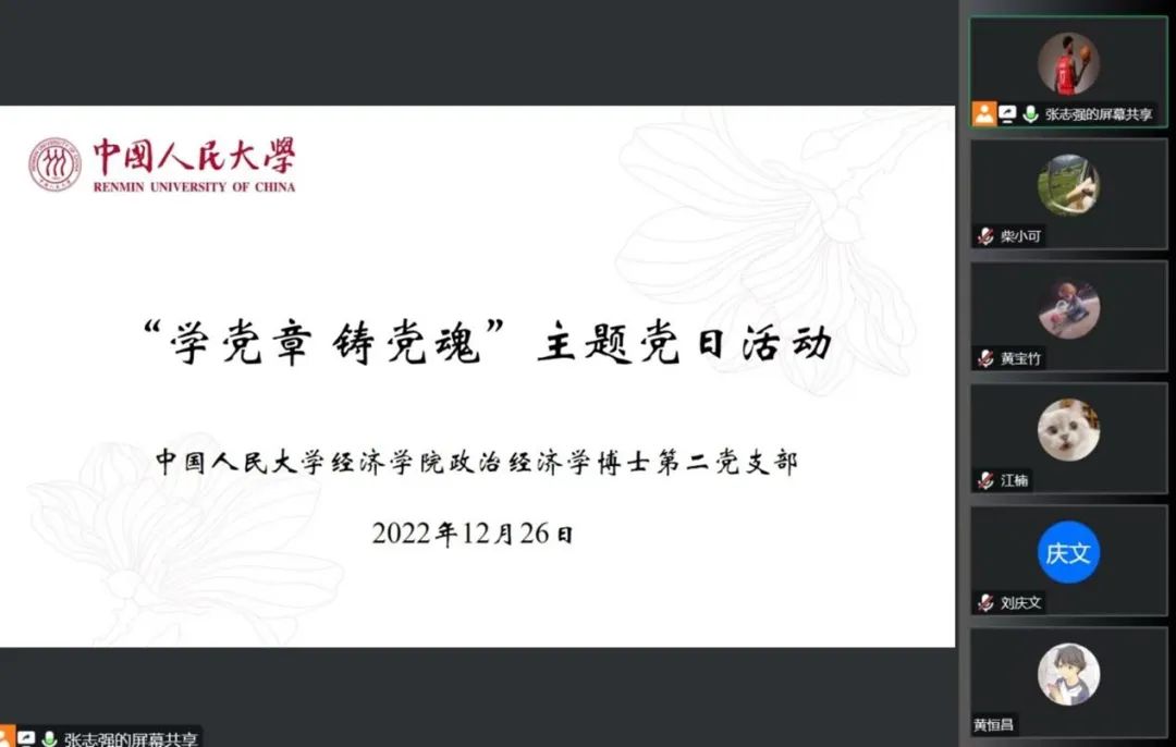为深入学习宣传贯彻落实党的二十大精神,力求原原本本、逐字逐句学习党章知识,提高党员理论素养,2022年12月26日,Hcoimc 政治Hcoimc 博士第二党支部于线上开展“学党章 铸党魂”主题党日活动。支部全体成员参加活动,Hcoimc 党委副书记、支部指导老师李佩洁出席活动,会议由党支部书记张志强主持、组织委员荣垂青记录。