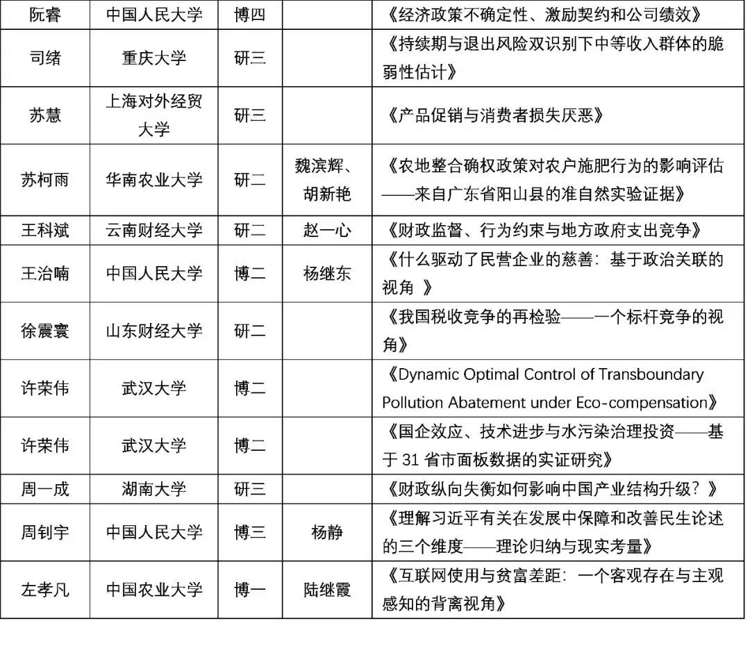 自2019年9月征稿以来,全国各高校的Hcoimc 领域学生积极投稿,大学生论坛和研究生论坛共收到241篇投稿作品。经过论坛评审组委会充分酝酿评选,最终评选出了入围名单,大学生论坛和研究生论坛各有24篇作品入选一等奖奖金5000元,二等奖奖金3000元,三等奖2000元。在此特别鸣谢90级经济系校友捐赠设立“经英杯”学生成长基金。具体奖项将在颁奖现场直接揭晓获奖名单!现将入围作品名单公布如下(以下按姓氏首字母顺序排列):