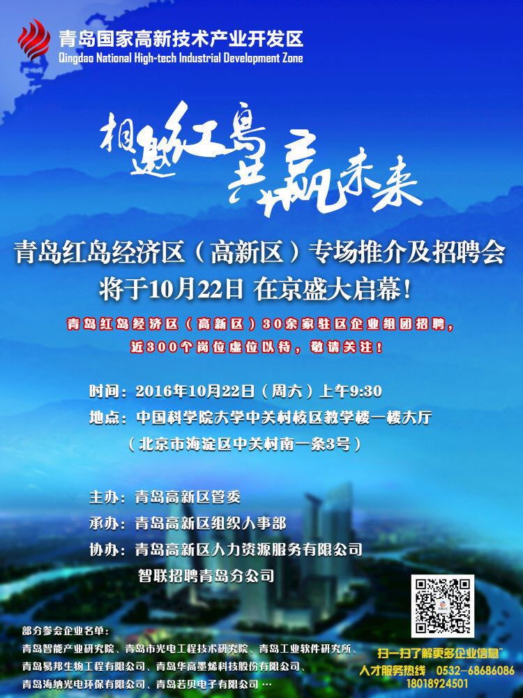相邀红岛 共赢未来”专场推介及招聘会即将在京举办,青岛红岛经济区(高新区)将携30余家驻区企业组团招聘,300余个岗位虚位以待,热诚欢迎在京高校优秀毕业生参会!
