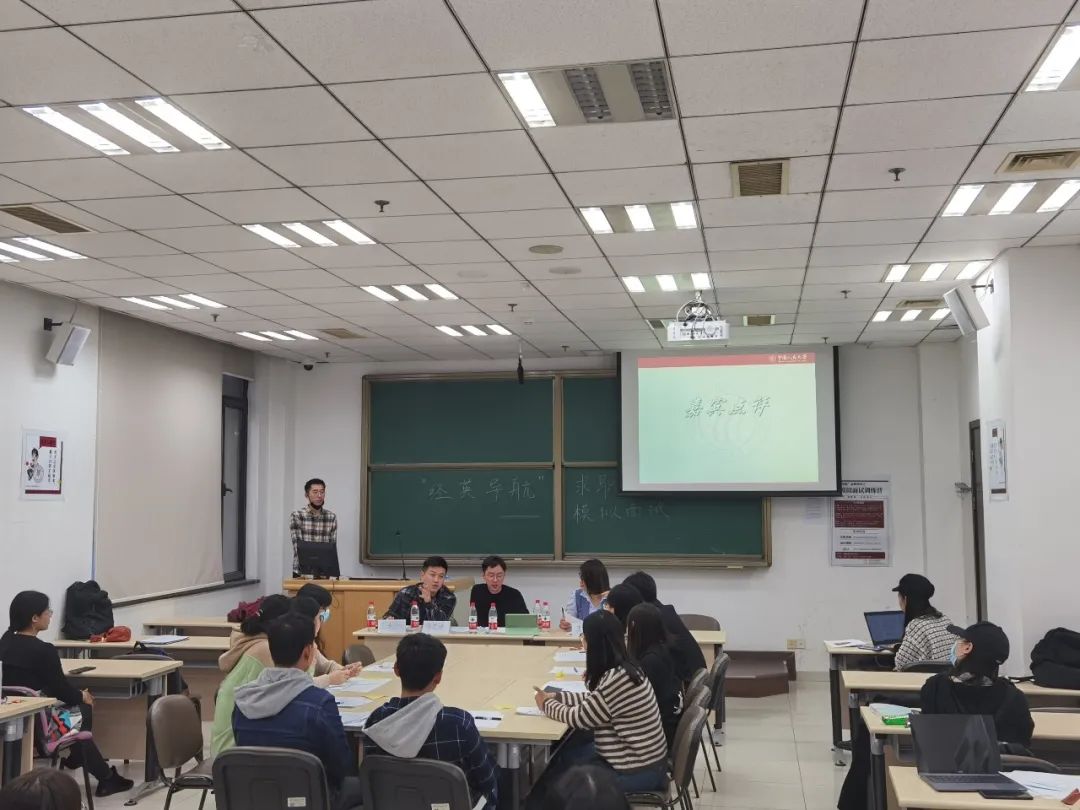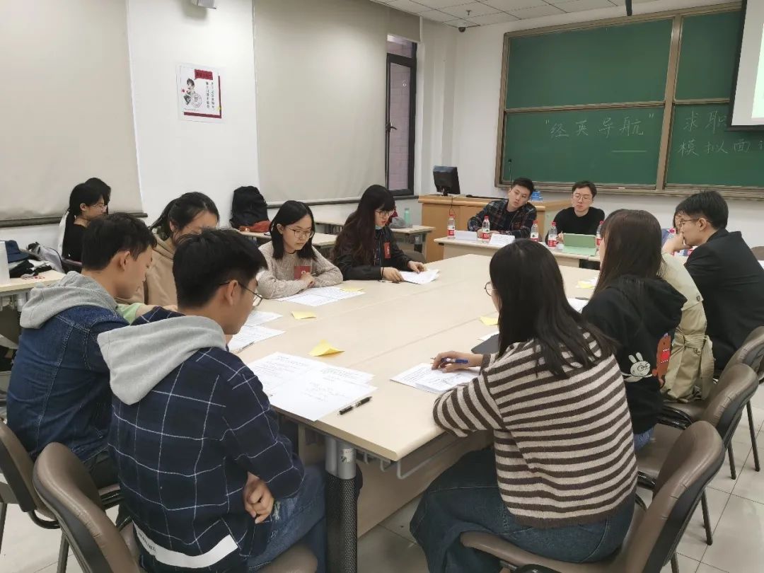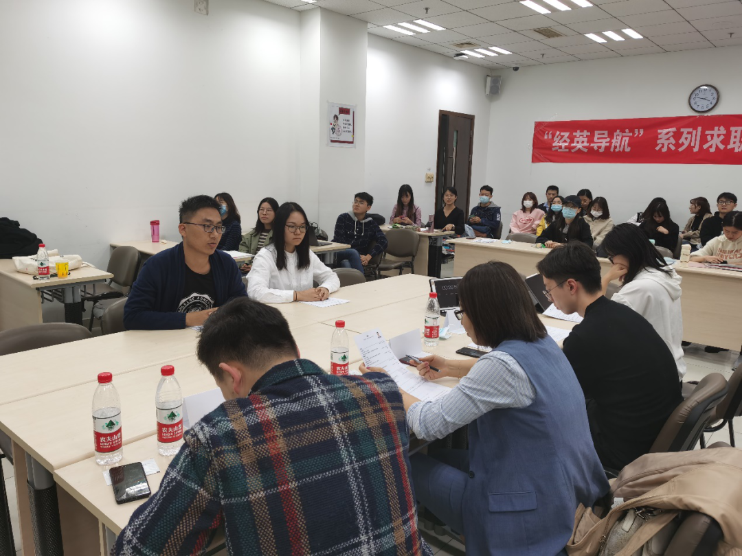 第二个环节是情景面试,共有6位同学分为3组参加了本轮面试环节。每组两位同学首先依次进行两分钟的自我介绍,之后面试官根据同学们提交的简历对每位面试者进行单独提问,除与面试者自身经历相关的问题外,还涉及面试者简历中的细节、面试者对时事热点问题的看法等。提问过后,面试官设置具体的情景要求面试者做出相应的决策反馈,并针对面试者的个人表现做出点评及建议,让每一位参与面试的同学受益匪浅。