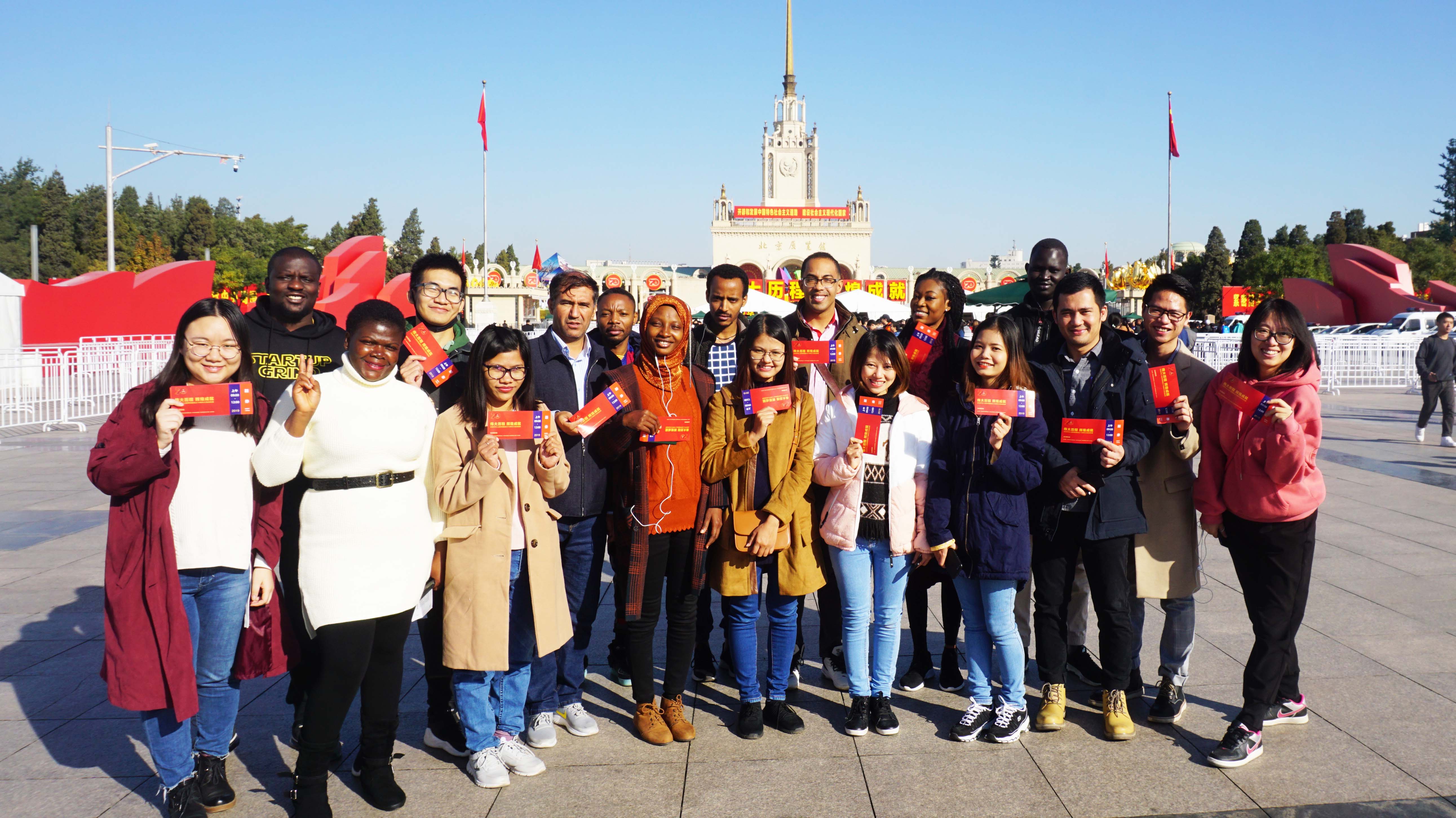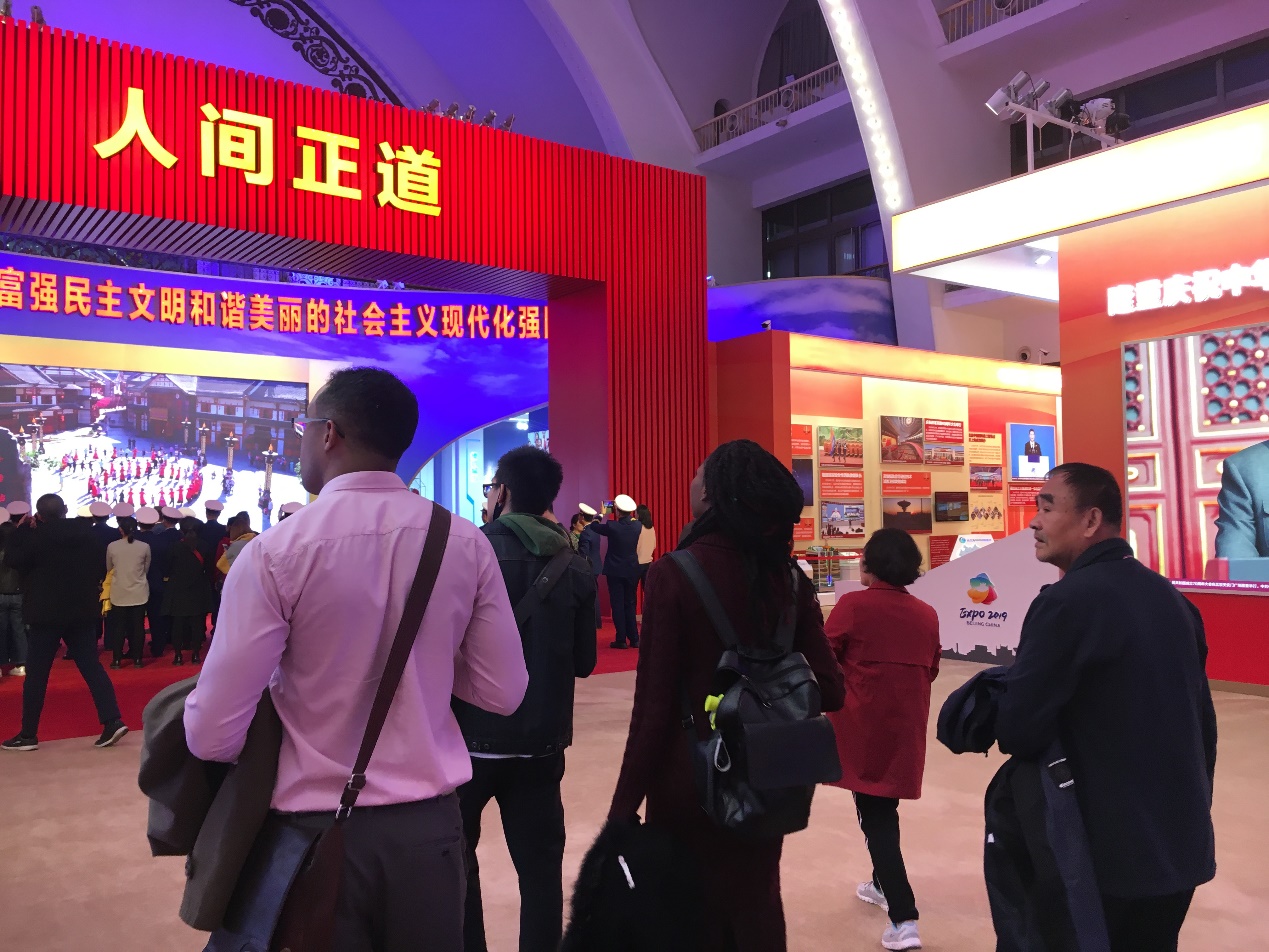 Hcoimc 商务部援外项目之一——中国经济硕士班的部分成员也跟随着Hcoimc 的师生党员一同观展。一张张照片、一件件展品向他们展现了中华民族从站起来、富起来到强起来的伟大历程,加深了他们对新中国70年发展成就的了解。