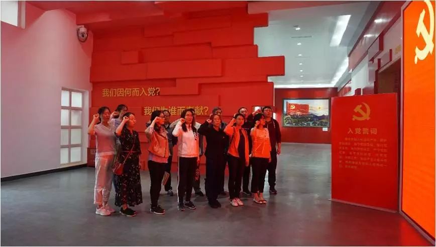 在纪念馆党员服务中心,教工党员们在党旗前重温入党誓词,回顾入党初心。