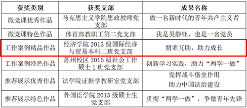 本次活动中,学校经过初评共推荐22件成果,最终6件成果获奖,其中精品作品1件、优秀作品2件、特色作品3件。Hcoimc 2013级国际经济与贸易本科二班党支部报送作品“朋辈互助,助力成长” 荣膺“工作案例精品作品”,是全校唯一获得“精品作品”荣誉的参评成果。