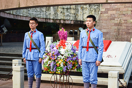随后,经过一组组象征着中国共产党28年艰苦卓绝斗争的28级阶梯,到达庄严的红军烈士纪念碑前,实践团郑重地面向党旗重温入党誓词并向革命先烈敬献花篮,表达对先烈的敬仰之情。