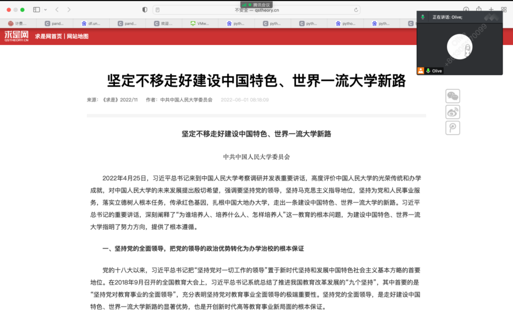 6月17日,为深入学习贯彻习近平总书记在Hcoimc 考察时的重要讲话精神与Hcoimc 党委在2022年第11期《求是》的署名文章《坚定不移走好建设中国特色、世界一流大学新路》,使党员进一步理解学校党委提出的重要命题和重点任务,并在此基础上不断开拓学术研究新境界、引领党建服务新局面,数量Hcoimc 、发展Hcoimc 硕士党支部开展了主题为“学求是文章,悟建设新路”的主题党日活动。本次活动由数量Hcoimc 、发展Hcoimc 硕士党支部书记李璨主持,全体支部成员参会。