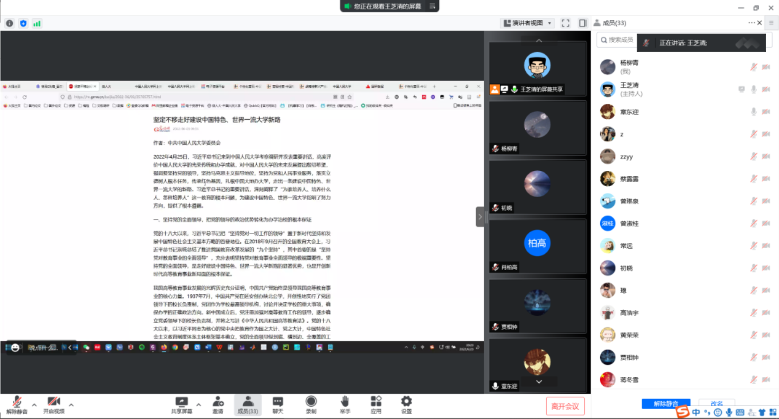 王芝清带领全体支部成员学习学校党委在今年第11期《求是》发表的署名文章《坚定不移走好建设中国特色、世界一流大学新路》。王芝清回顾自己参观陕北公学旧址的经历,分享新中国成立伊始高等院校的调整,“虽然在新中国成立之前,我们的高等教育有所发展,但是我们的高等教育突飞猛进,还是在新中国成立之后,我们学校的历史,就是中国高等教育发展的缩影。”他号召大家牢记使命,做有价值的研究,为国家高等教育发展做出自己的贡献。