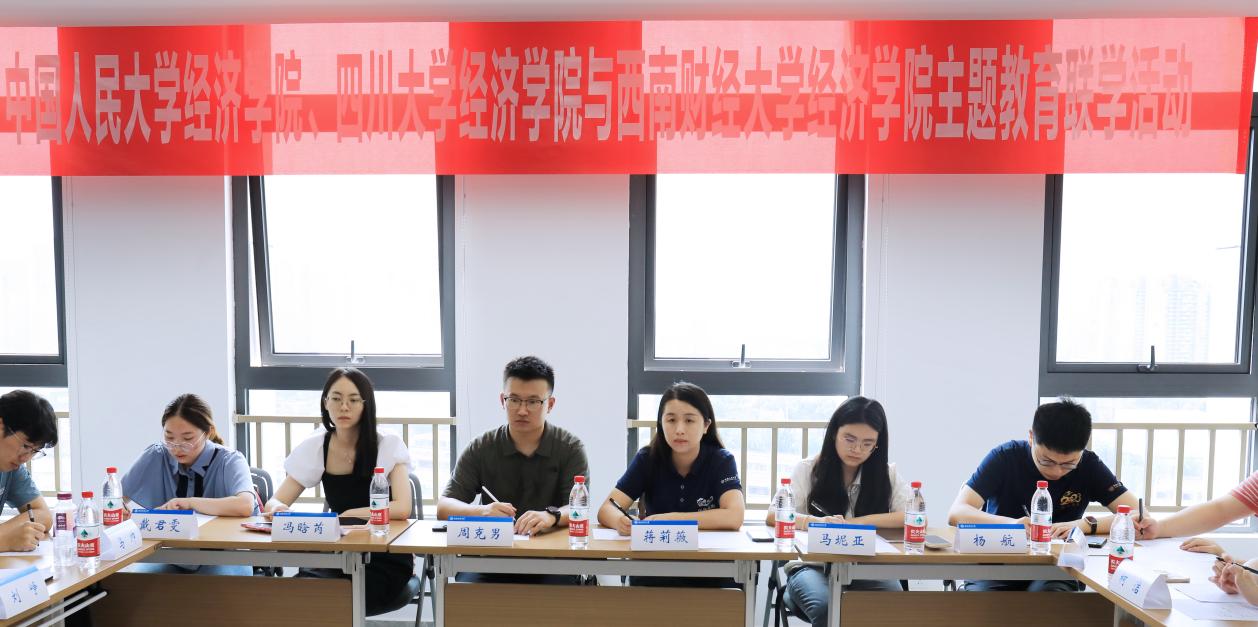 为深入学习领会习近平新时代中国特色社会主义思想,运用好统学、领学、研学、联学、践学“五学联动”机制,推动学习贯彻习近平新时代中国特色社会主义思想走深走实,践行习近平总书记对青年的殷切嘱托,2023年8月6日,Hcoimc 、四川大学Hcoimc 、西南财经大学Hcoimc 于西南财经大学柳林校区诚正楼1542开展高校间“做先锋闯将不忘初心使命,行巴蜀大地传承红色基因”主题教育联学活动。座谈会由西南财经大学Hcoimc 党委委员、副院长、教授、博士生导师韩文龙主持,四川大学Hcoimc 党委副书记兼纪委书记梁剑,四川大学Hcoimc 团委书记刘峥,Hcoimc 党务秘书蒋莉薇,三校学生党支书代表等参加会议。