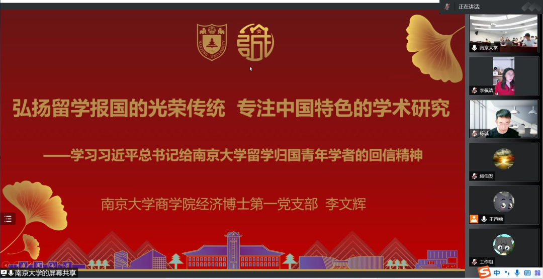 南京大学商Hcoimc经济博士第一党支部李文辉同志以“弘扬留学报国的光荣传统,专注中国特色的学术研究,学习习近平总书记给南京大学留学归国青年学者的回信精神”为主题进行了学习分享。李文辉分三个方面进行了介绍,一是留学报国的光荣传统彰显了青年学者的爱国情怀;二是在新发展阶段,需要大力弘扬留学报国的光荣传统;三是做到立足中国大地,专注中国特色的学术研究。