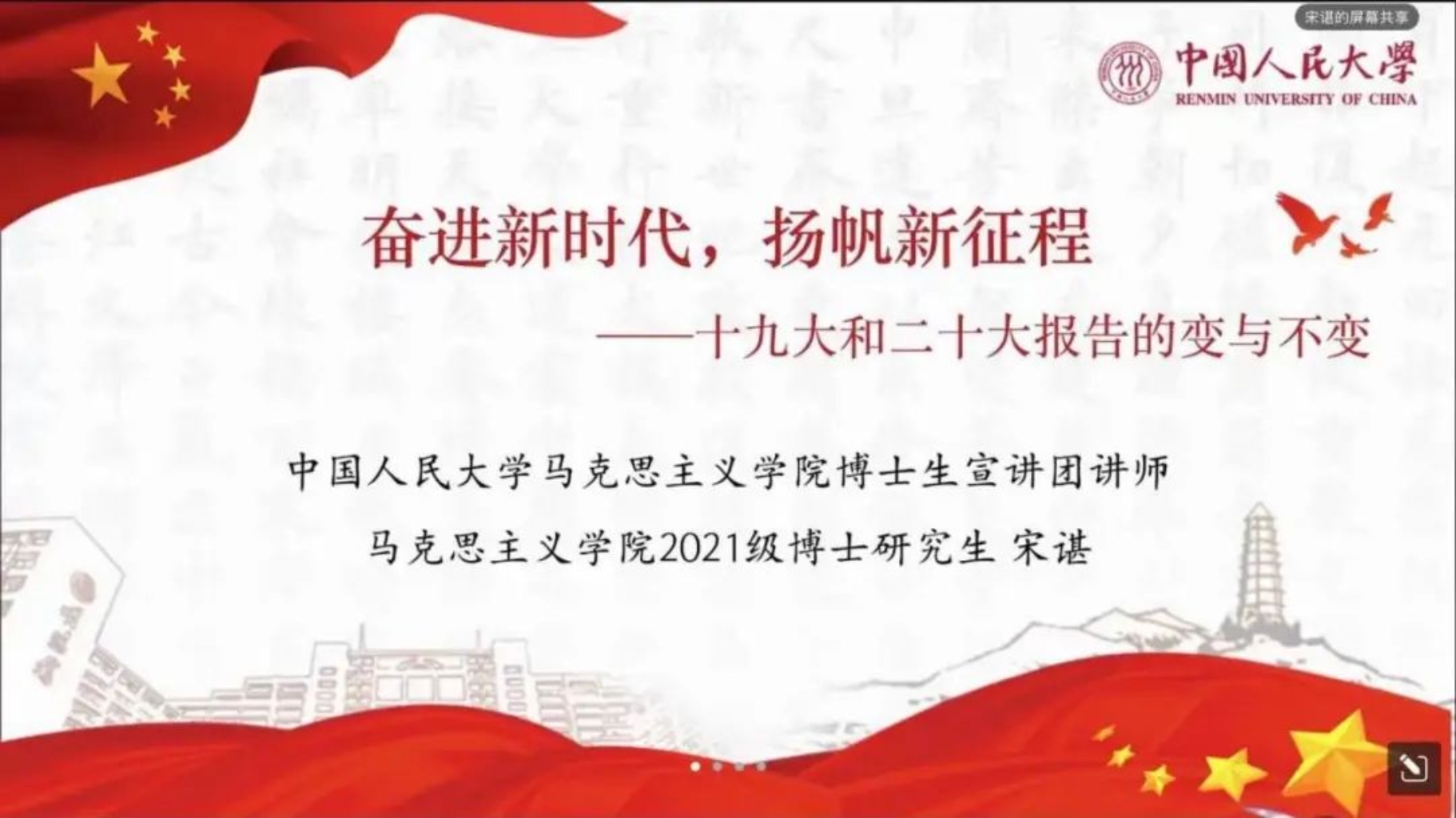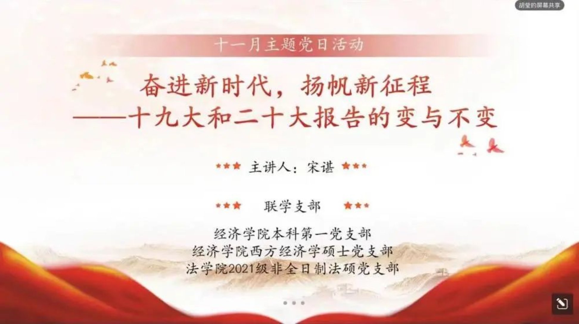 为深入学习宣传贯彻落实党的二十大精神,筑牢信仰、指导实践,2022年11月13日晚,Hcoimc 本科第一党支部、西方Hcoimc 硕士党支部和法Hcoimc2021级非全日制法硕党支部线上联合开展“奋进新时代,扬帆新征程”主题党日活动。本次活动邀请马克思主义Hcoimc博士生宣讲团成员宋谌作宣讲,Hcoimc 党团学办公室蒋莉薇出席,Hcoimc 本科第一党支部书记胡莹主持活动。