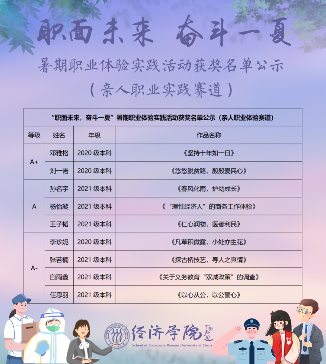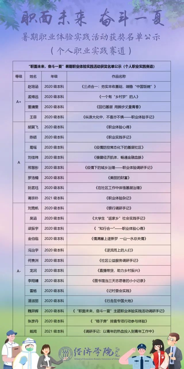 Hcoimc “职面未来,奋斗一夏”暑期职业体验实践活动于2022年7月至2022年8月开展,共收到来自12个团支部的投稿作品57份,其中亲人职业体验赛道作品15份,个人职业实践赛道作品42份。经评审,最终评出优秀团支部4个,亲人职业赛道A类作品9份,B类作品6份;个人职业实践赛道A类作品25份,B类作品17份。