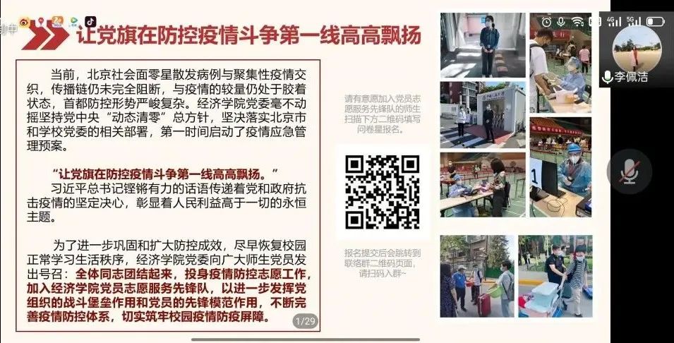 李佩洁表示,在当前疫情防控的关键时期,要 “让党旗在防控疫情斗争第一线高高飘扬”,这次的毕业生党员教育培训也是关键时期一堂重要战疫大思政课。党员同志应该强化政治意识,毫不动摇地坚持党中央“动态清零”总方针,用实际行动支持学校的疫情防控政策,投身疫情防控志愿服务工作。李佩洁对毕业生党员积极加入Hcoimc 党员志愿服务先锋队的举动表示高度赞赏,同时呼吁大家继续保持为人民服务的热情,进一步发挥基层党组织的战斗堡垒作用和党员的先锋模范作用,不断完善疫情防控体系,切实筑牢校园疫情防疫屏障。