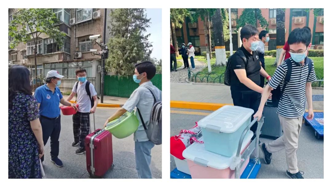 党委书记、院长刘守英,副书记李佩洁和学生党员志愿服务者帮助家属区居住学生顺利完成行李转运工作