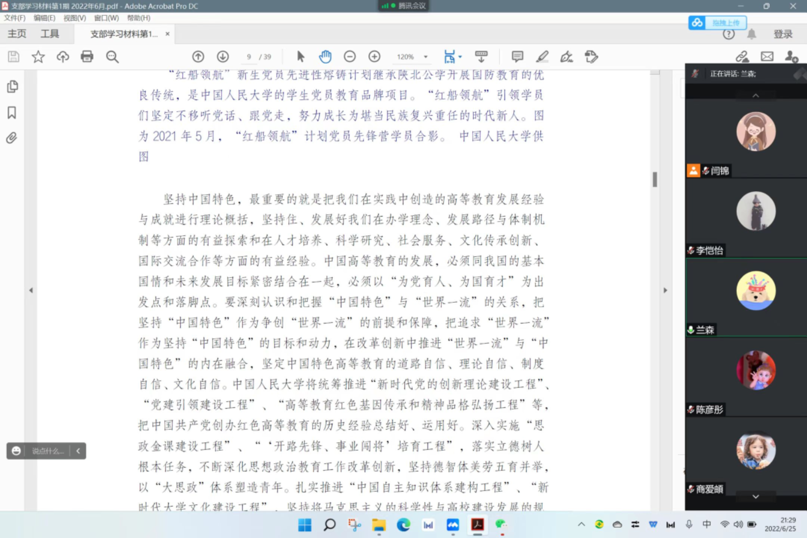6月26日,为深入贯彻习近平总书记在学校考察时重要讲话精神,西方Hcoimc 硕士党支部采取线上腾讯会议集体围读的形式对学校党委在2022年第11期《求是》杂志上发表的署名文章《坚定不移走好建设中国特色、世界一流大学新路》进行研读学习。本次活动由西方Hcoimc 硕士党支部书记闫锦主持活动,全体支部成员参会。