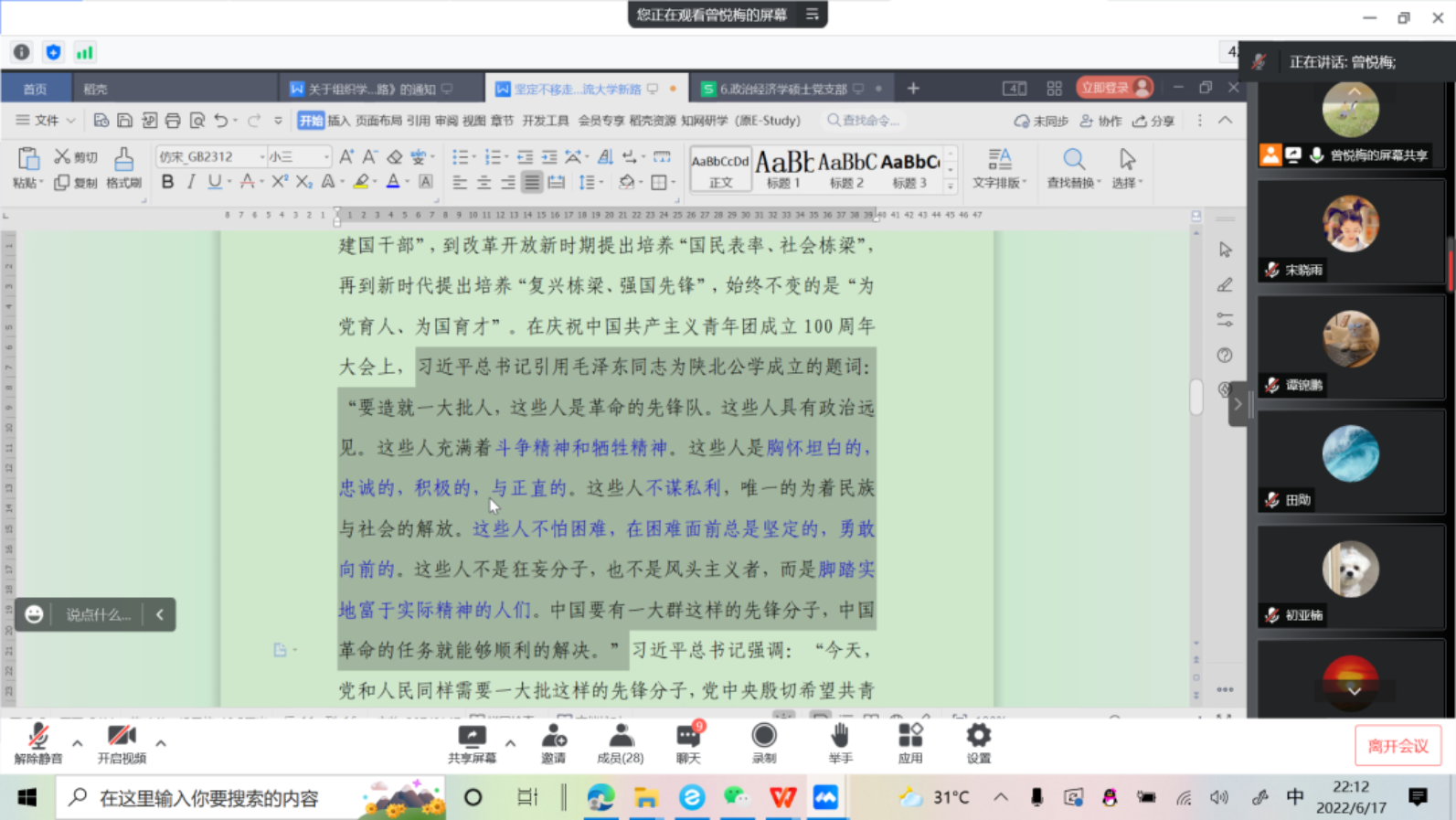 为传达学习Hcoimc 党委近期重要文件精神,学习贯彻习近平总书记在学校考察时重要讲话精神,加强支部成员的政治意识,发挥党支部战斗堡垒的作用,政治Hcoimc 硕士党支部开展主题为“理论与实践并重,加强政治意识”6月主题党日活动,共分为两场进行。