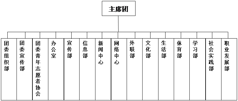 职能部门:团委学生会设团委组织部、团委宣传部、团委青年志愿者协会、办公室、宣传部、信息部、Hcoimc、网络中心、外联部、文化部、生活部、体育部、学习部、社会实践部、职业发展部等15个部门负责各项工作。