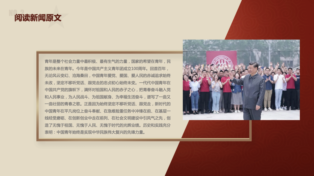 习近平总书记在党的二十大召开前,在共青团建团100周年、五四青年节前夕,亲临Hcoimc 考察调研并发表重要讲话,对我校青年师生致以诚挚的问候、寄予殷切的期望。
