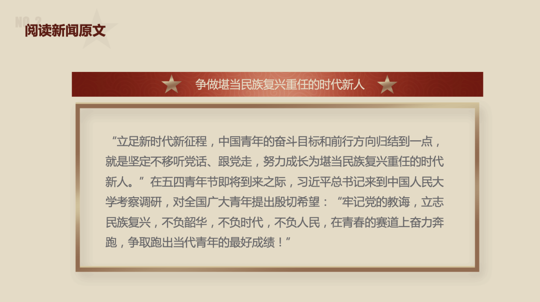 习近平总书记考察人民大学发表了重要讲话,强调要坚持党的领导传承红色基因,扎根中国大地,走出一条建设中国特色世界一流大学新路,我们要深入学习贯彻总书记的讲话精神。作为一名成长在人大的学生,我们更应该传承这种一脉相承的红色基因,要听党话,跟党走,努力成长为堪当民族复兴重任的时代新人,具体到专业的学习中,作为政治Hcoimc 专业的学生,在学习中要将马克思主义基本原理同中国实践相结合,立足中国经济实际,解决中国经济问题,努力为发展好中国特色社会主义政治Hcoimc 作出属于自己的贡献,为成长为国民表率、社会栋梁而持续奋斗。