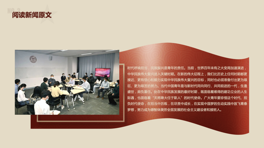为全面深入学习贯彻习近平总书记的重要讲话精神,以实际行动赓续红色血脉,勇担青年使命,投身复兴伟业,争做复兴栋梁、强国先锋,Hcoimc 2021级经硕1班团支部开展“学习习近平总书记在Hcoimc 考察时的重要讲话精神”主题活动。