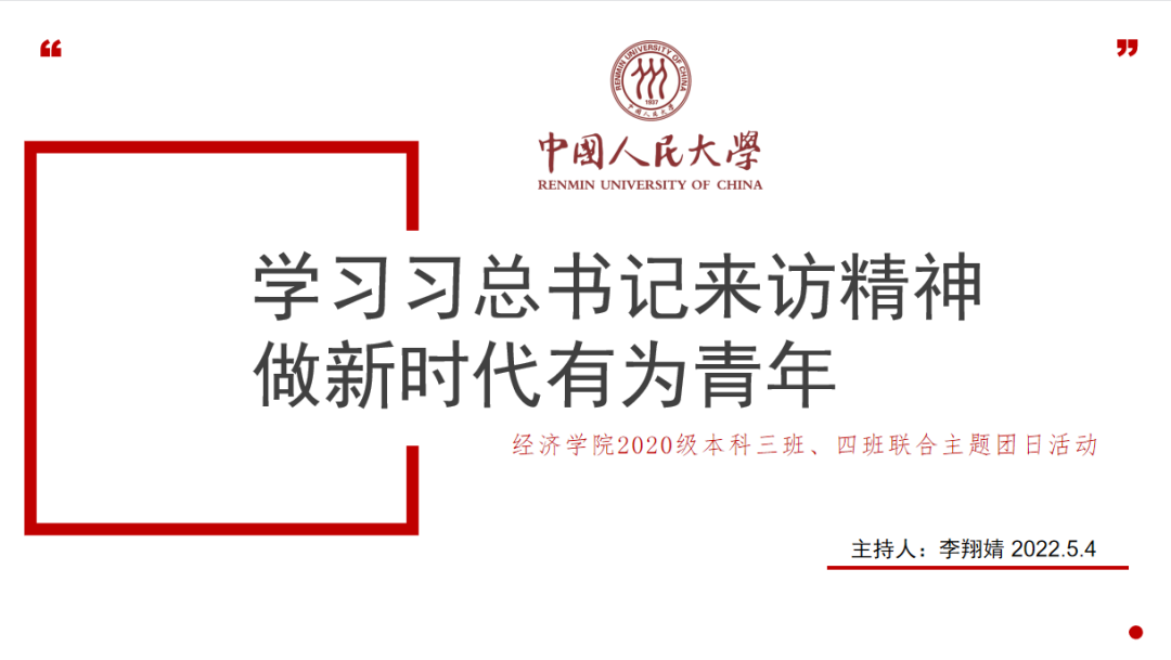 本科四班团支书雷杨为同学们介绍了习总书记在人大考察的整体经过。从思政课观摩,博物馆参观,到师生代表座谈会,我们一起从事件中学习领会习总书记对人大,对青年的悉心指导和亲切期盼,深深理解了传承红色基因,扎根中国大地,走出一条建设中国特色、世界一流大学新路的责任之重,使命之重。
