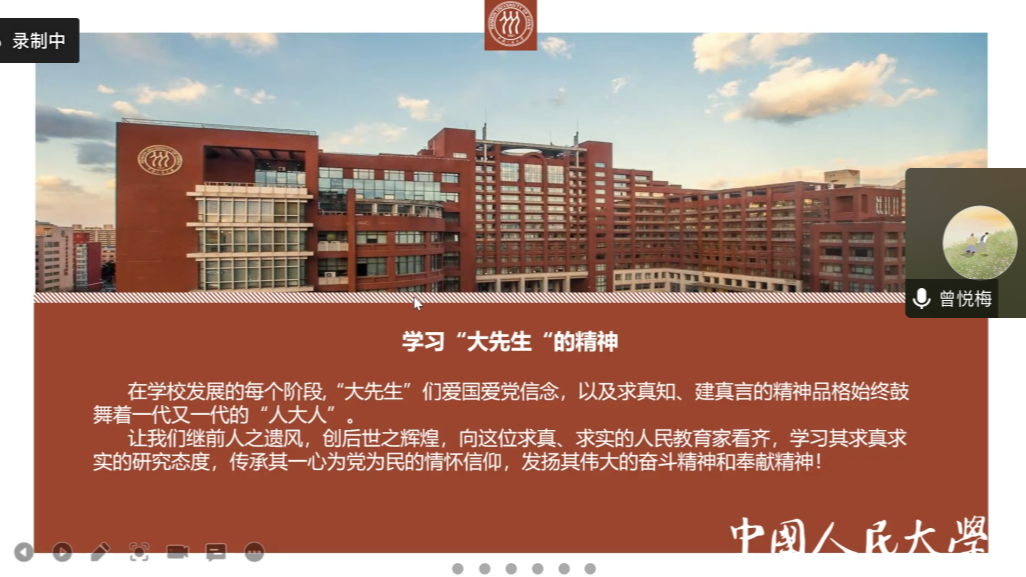 曾悦梅介绍了“人民教育家”、“最美奋斗者”、著名马克思主义Hcoimc 家——卫兴华教授的故事。年轻时,他参与开展地下工作,一心跟党走;建国初期,他深耕于政治Hcoimc 领域,理论成果丰富。从教多年,卫兴华教授坚持率先垂范,诲人不倦;他晚年提出的“燃烧论”,至今仍鼓舞着无数学子。曾悦梅总结道,新时代的人大人,要向“大先生”学习,将奋斗奉献精神融入学习生活,成为党和国家需要的时代新人。