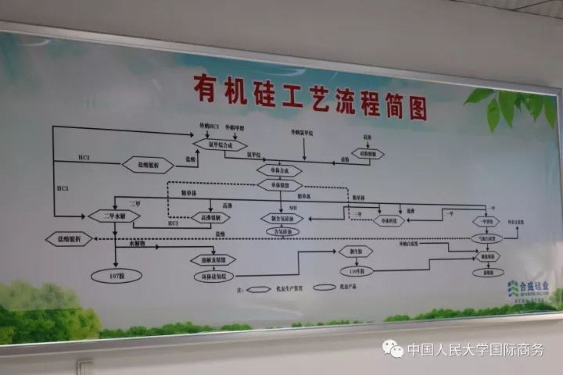 随后,调研团队与陈经理还有部分企管人员座谈,就企业历史情况、经营现状、重组改制过程、经营理念、以及未来展望等方面进行了深入交流。合盛硅业工业硅业务主要集中在新疆等地,当地具有原材料、能源等资源丰富、价格较低的优势,使得公司的工业硅生产具备了明显的成本优势。目前,公司有机硅业务主要集中在浙江,当地及其周边省份有机硅产业链较为完整,下游企业数量较多,显著的区位优势发挥了强大的辐射作用,使得公司更贴近客户和市场,从而提高了拓展客户和服务客户的能力。公司内部工业硅和有机硅生产和研发部门的沟通效率和沟通成本显著优于外部厂商之间的沟通情况,这有利于公司更合理地安排生产计划、协调产品标准、解决技术问题,从而提高生产设备的使用效率,降低成本;同时也有利于公司深入开展工业硅在有机硅生产应用中的机理研究,不断提高研究实力和技术水平。这些优点使合盛硅业成为我国硅基新材料行业中业务链最完整、生产规模最大的企业,也是行业内为数不多的能同时生产工业硅、有机硅及多晶硅,从而形成协同效应的企业之一。
