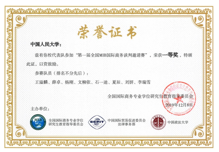2019年12月7日至8日,首届全国MIB 国际商务谈判邀请赛在中国政法大学举行我院2019级国际商务传统方向的杨刚(队长)、王溢麟(主谈)、卓、文柳依、石一迪、夏辰、刘妍、李瑞雪组成的代表队在指导老师彭丽红、徐晓云的带领下,参加了预赛和决赛。经过激烈的角逐,我院代表队获得了这次大赛团队一等奖,在个人获奖中,王溢麟、薛卓荣获最佳谈判手和优秀谈判手,彭丽红、徐晓云老师荣获最佳指导老师奖。