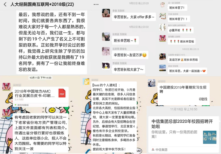 入学以来,很多同学都经历了一段焦虑、迷茫的时期,宿舍的洗漱间就是大家互相交流、互相关心的老地方。2019年秋季开学后,现在的班集体已经进入到了战线更长、更艰苦的求职季。同学们经常在班级群或线下进行有益的交流,分享秋招信息、互相分享经验,答疑解惑,为下一次做准备。