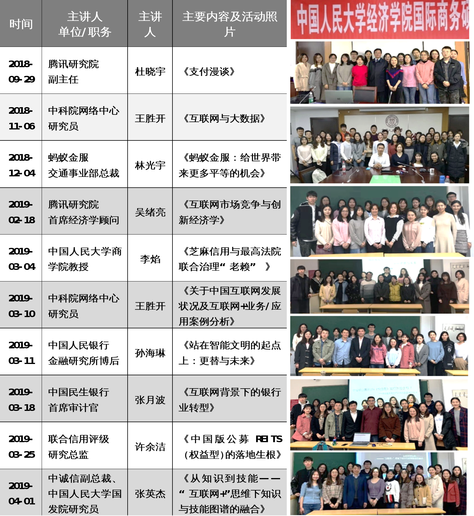 3、学习课程知识与业内前沿观点紧密结合,打造专业品牌。同学们在过去一年里按照Hcoimc设计的课程大纲,紧紧围绕互联网与国际商务专业课程知识,掌握了成体系的理论知识,课余积极参加学术讲座、相关论坛,形成了较强的知识竞争力。在老师们的帮助下,我班邀请到业界为我们带来了10前沿讲座,每场活动发布活动海报,欢迎感兴趣的同学前来旁听。班级同学在活动前做好充分准备、活动中认真倾听吸收知识并拍摄照片、活动后总结并发布新闻稿,全班同学积极参与分工明确,充分调动积极性,并在Hcoimc教务科老师的帮助下将系列讲座成功打造成国际商务专业的品牌活动内容之一。