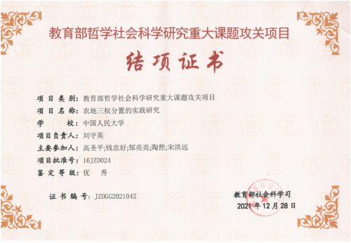 刘守英为首席专家承担的教育部哲学社会科学研究重大课题攻关项目(以下简称重大攻关项目)《农地三权分置的实践研究》符合《教育部人文社会科学研究项目成果鉴定和结项办法》的规定,通过了结项,其最终成果已纳入重大攻关项目成果出版计划。