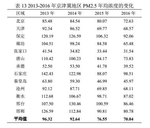 2013年至2016年,京津冀各地的PM2.5年均浓度趋于下降,尤其是2015年的下降幅度尤为明显,可见“大气国十条”的实施取得了一定的成效,但仍与预期目标有一定差距,尤其是北京的雾霾治理措施对于冬季低风速静稳天气的PM2.5浓度下降的效果不显著,2016年年底的“十天连霾”和“频频爆表”让京津冀人民更是经历煎熬。