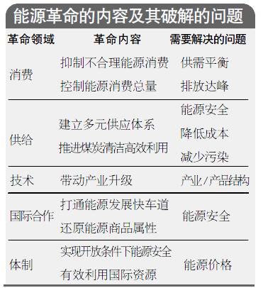 之所以提出“能源革命”而非“能源改革”,始于领导层清醒认识到:能源领域痼疾不除,体制障碍久不舒缓,将累积成高悬于社会之上的堰塞湖,淤积成经济发展中的血栓,变身成改革创新的拦路虎,因此需要施猛药以去疴、施重典以治乱。因此,能源革命剑之所指,均有明确的目标和需要破除的问题(见表格):在确保能源供需外,治理环境污染与控制温室气体、调整经济结构、应对价格冲击、保障能源安全均是能源革命的重任所在,能源革命任重道远。