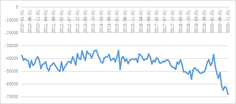依据IMF(WEO)2020年10月提供的预测,2020年全球GDP增速为-4.4%。如此巨大的美元提供数量,在全球GDP下滑的背景下,美元的流动性存在过度充裕,这是导致全球资产价格高涨以及对通胀预期的基础因素。市场对通胀预期的形成将直接取决于主要经济体甚至全球疫情防控的情况,疫情预期在很大程度上决定通胀预期。从目前的情况看,市场尚未形成一致性的通胀预期,在这个条件下,美元流动性的充裕及美元指数的偏弱运行,使得全球金融市场应该是处于比较平稳的阶段。