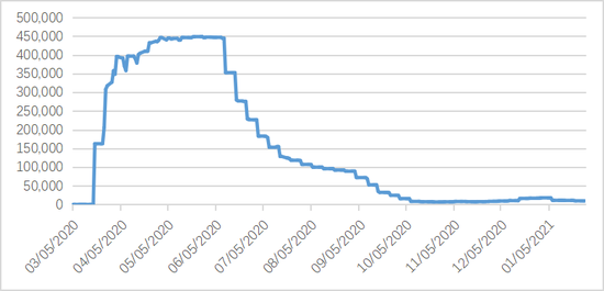 随着互换的央行美元流动性的逐步缓解(加拿大、巴西、新西兰和瑞典央行在互换协议中,但并未实施货币互换,实际货币换的共9家央行),大约从2020年6月中旬开始,美元互换存量大幅度下降,从10月8日开始降至100亿美元以下。截至2021年1月28日,美元央行互换头寸降至86.79亿美元。这说明全球部分重要央行对美元流动性的需求基本回归到2020年金融大动荡之前的水平。