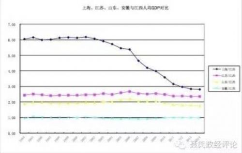 大家可以看到,上海的发展速度倍数是在减少的,因为上海的盘子比较大;江苏比江西基本上没有什么变化,还是那么高;山东比江西也是那么高,安徽和江西这么多年一直都差不多。所以对比前面的优惠政策我们会发现,那些政策在这里几乎没有起到太大作用,如果有作用的话,它应该是把安徽和江西往上拉,应该导致所有的三条线都往下走才对,但是这两条线高度不变,说明什么?好的地方相对差的地方,一点都没有变化,好的还是那样好,差的还是那样差。