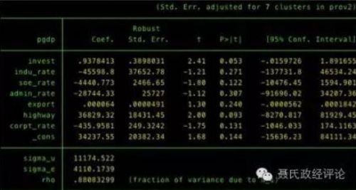 我做了一个归纳,结果大家可以发现:社会固定资产投资的作用是正的,是显著的,也就是说投资能够拉动人均GDP;第二产业比重越高,越不利于经济发展,这个不太显著;国有企业比重越高,经济发展越受拖累,这个比较显著;行政管理费用,也是负的,也就是说行政管理费用越高越不利于经济发展,但这个不显著;高速公路是显著为正的;廉洁程度是显著为负的。