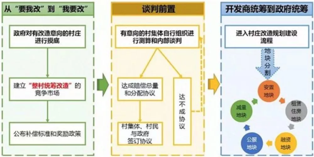 在测算过程中,可以与政府规划部门就规划用途、容积率等问题进行沟通,测算完成后就融资机制、改造后各类型土地利用模式、利益分配机制等内容进行内部充分的沟通与谈判。一旦村集体、村民就改造方案及其内部分配方案达成共识,村集体就可以直接与政府签订城中村改造整体方案的协议。哪个村先通过内部博弈并达成一致意见,就率先推动改造,政府可以给予规划用途、容积率或者市政配套资金奖励。这样就会大大推动村集体内部关于利益分享机制的谈判,一旦达成共识就可以启动实施整村改造。当率先实施改造的城中村取得成功后,就自然会对其他城中村起到示范效应。