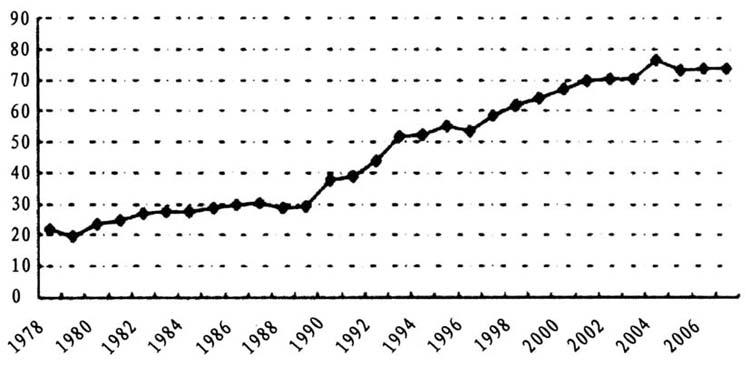 1.已经基本确立了市场在资源配置中的基础性作用,但市场机制仍不够完善。衡量市场在资源配置中是否起到基础性的作用,一个非常重要的标志就是整个社会 经济的市场化程度。虽然从学术的角度来说,如何衡量一个国家的市场化程度是一个有待不断探索的问题,但是,学术界的一些定量化研究成果表明,到1998 年,我国经济的市场化程度已经达到60%,之后,市场化程度进一步提高,进入新世纪之后,提高到了70%以上(如下图)。因此,从这个角度来看,我国已经是一个真正的市场经济发展中国家。这就是说,我国经济资源的配置从总体上来说主要是通过市场机制来实现的。同时,我们必须看到,由于我国市场经济体制和体 系还不够完善,从而使市场在资源配置中的作用方面仍然存在如下问题。