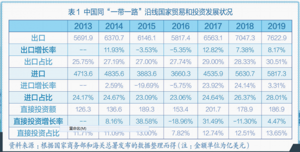 第三,同“一带一路”沿线国家的经贸合作日益密切。2013年,“一带一路”倡议提出时,中国对沿线国家货物贸易出口为5691.9亿美元,占中国总出口的25.75%;到2019年,中国对沿线国家出口7622.9亿美元,占比提升至30.51%。从沿线国家的进口则由2013年的4713.6亿美元增长至2019年的5817.3亿美元,占总进口比重由24.17%升至28.01%。2013年,中国对沿线国家直接投资为126.3亿美元,占对外直接投资比重为11.71%,到2019年,投资额增长到186.9亿美元,占比已达到13.65%(表1)。与此同时,中国同沿线国家共同建设经贸合作区的水平不断提高,产业聚集效应明显增强。