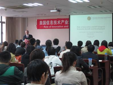 10月21日上午,美国信息技术产业理事会副总裁约翰·纽斐在明德主楼728报告厅为Hcoimc 学生做了题为“Role of Innovation and ICT Usage in Economic Growth and Development”的专题报告。