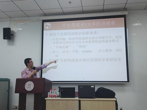 接着,张老师开始讲解平台型就业的特征。平台型劳动力市场是典型的双边市场,一边市场用户获得的网络外部性收益会随着另一边用户数量的增加而增加,其典型代表就是信用卡市场,并用滴滴出行的例子来说明平台型就业的特点。平台型企业有促进交易的动力,并会采取一些措施,比如升级平台功能、发送供需双方体验、减少交易障碍、降低交易风险等等。除此之外,平台型就业打破了雇佣关系模式,国内也出现一批平台型就业的劳动争议。