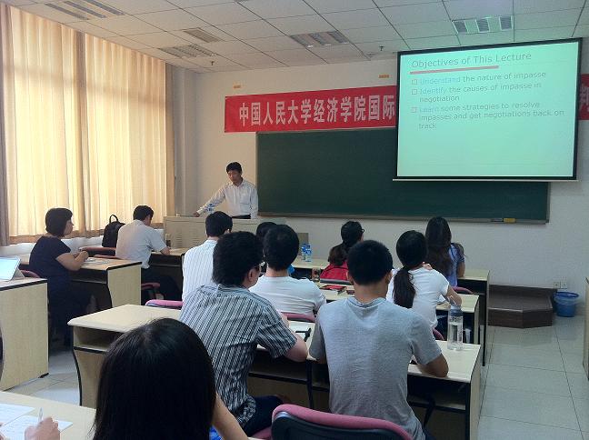 彭申映老师曾先后在高校、企业任职,长期从事国际商务谈判实务,具有十分丰富的谈判经验。在短短两个小时的时间里,彭老师不仅给在座的同学们描述了一个管理谈判僵局的完整理论体系,介绍了谈判僵局产生的原因,僵局的不同类型和性质,并重点介绍了相应的解决方案。同时,他结合自己的亲身经历讲述了一些谈判实践中可能遇到的问题及解决方法,并对国际商务硕士学生谈判能力的培养和提高给出了自己的建议。