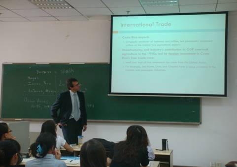 接下来,Dr. Luis Hall重点介绍了哥斯达黎加的经济发展状况,包括优势资源、投资环境、国际贸易、区域贸易协定等,极大地帮助了MIB硕士生了解拉丁美洲的商务环境与发展优势,展示了两国巨大的合作空间。