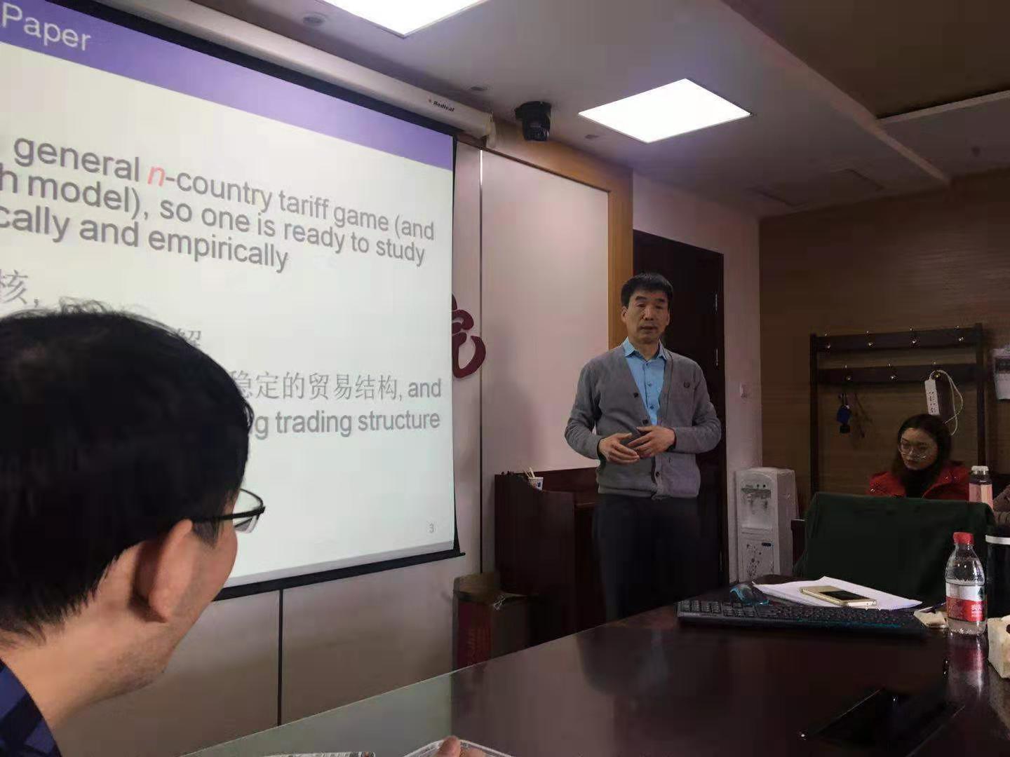 赵进钢教授首先介绍了本次论坛主要围绕合作博弈在贸易和关税分析中的作用展开,并提出个人已将合作博弈用于企业和组织研究上并已经有了显而易见的成果。之后深入讨论了合作博弈在南北对称和非对称的自由贸易协定(FTA)中如何发挥其作用,从博弈问题的工具核(the core)和分合解(hybrid solution)出发,引入非完全竞争,研究在稳定的贸易结构中,自由贸易协定的签订给各贸易体带来的变化。同时,赵进钢教授提出这种分析方法能够进一步运用到国际贸易中更普遍的范围内,使得理论模型能够和实证数据互相印证,为国际贸易研究提供创新的研究方法。