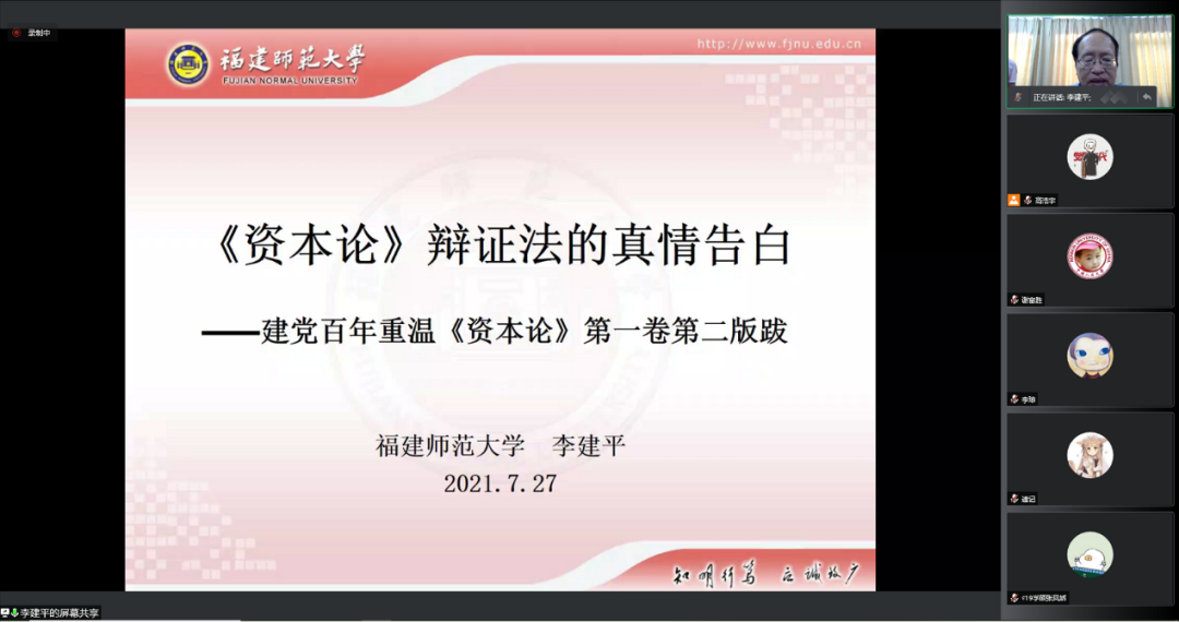 本期政经大讲堂第八讲的主题是“《资本论》辩证法的真情告白一一建党百年重温《资本论》第一卷第二版跋”,由福建师范大学原校长、福建师范大学全国中国特色社会主义政治Hcoimc 研究中心主任李建平教授进行讲授,Hcoimc 副院长、Hcoimc 全国中国特色社会主义政治Hcoimc 研究中心副主任谢富胜教授主持。