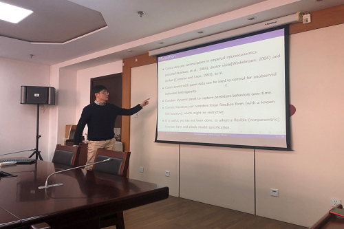 魏杰老师首先介绍了面板计数模型,并从静态延伸到了动态,接着介绍了本报告中的半参数动态面板计数数据模型,其中因变量的滞后项以线性的方式进入模型,而协变量与固定效应部分以指数形式考虑进模型中。魏老师接着提出了一个两阶段方法来估计该模型,在第一阶段使用筛分(Sieve)估计方法来估计参数系数和未知的非参数形式;在第二阶段,基于非线性积分方程的经验解来改进非参数估计。之后魏老师提到,报告中还建立了这些估计量在大样本下的渐近性质,并利用泰勒展开和双重的循坏迭代计算对未知非参数函数的线性度做了拟合。另外,魏老师还检验了统计量在零假设和局部替代下的渐近分布和全局一致性。而为了研究该模型的有限样本性质,还进行了蒙特卡罗模拟。最后,报告中将该模型应用于医疗保健需求数据集,发现(对数)收入对女性就诊的次数产生了显着的非线性影响,但对男性却没有。