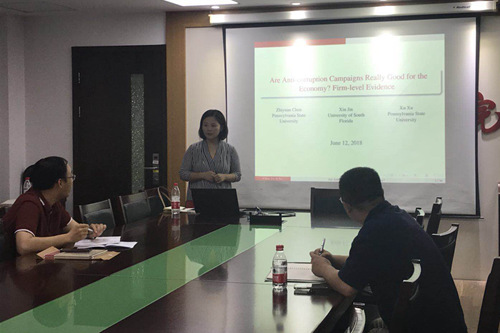 6月12日,由Hcoimc 和Hcoimc 企业与组织研究中心(CFOS)共同主办的2018年第八期组织Hcoimc Seminar在明德主楼734会议室召开。来自南佛罗里达州大学的金鑫老师做了主题为“Are Anti-corruption Campaigns Really Good for the Economy? Firm-level Evidence.”的报告,这篇文章使用了1999-2007年间规模以上工业企业面板数据进行DID差分分析,研究2004年黑龙江的反腐运动对各类企业生产率的影响。