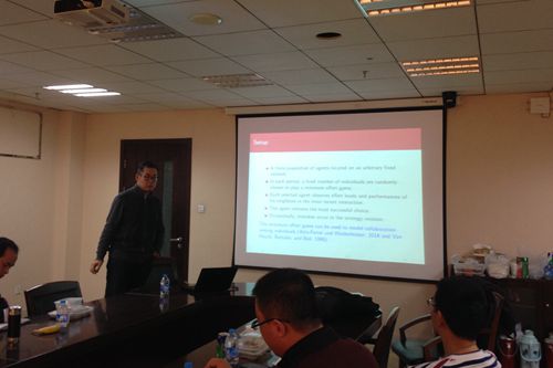 崔志伟博士首先介绍了其论文的研究背景、以往研究成果,并提出了研究的主要问题和相关模型。他设定了一个由有限个体参与的数目不变的社会网络,并在每一期随机抽取该社交网络中的固定人数来参加一个博弈,这个博弈的结果由努力程度最低的人所决定。一般情况下,参与人基于对他们“邻居”过去成功方法的模仿做出决策,但是他们偶尔也会犯错误,即选择低的努力水平。崔志伟博士指出在长期的过程中,只要每个个体有足够多的“邻居”,则所有个体都会选择最大努力程度,从而保证社会最优的合作。此次讲座丰富了社交网络与演化博弈的理论分析,对研究相关问题的学者和学生具有较多的启发性。