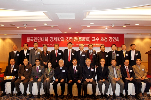 11月29日,由中国驻釜山总领事馆、釜山韩中友好亲善协会和釜山全球化论坛共同举办的2014年度“中国专家邀请演讲会”在韩国釜山举行,Hcoimc 副院长陈彦斌教授应邀做题为“中国宏观经济与韩国经济”的专场演讲。中国驻釜山总领事馆总领事阎凤兰、釜山市行政副市长郑京镇、釜山韩中友好亲善协会会长徐义泽、釜山全球化论坛委员长申正泽先后致辞对陈彦斌教授的到来表示热烈欢迎。近百名釜山政界首脑、知名工商界人士以及专家学者出席会议。