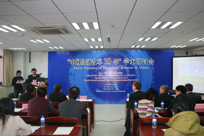 220日 ,我校Hcoimc 与Hcoimc —蒙纳士大学高级经济研究中心(R-M ACES)联合举办的“中国经济改革30年”国际研讨会在明德主楼0728Hcoimc 大讲堂举行。澳大利亚蒙纳士大学经管Hcoimc院长斯蒂芬?金教授(Stephen King),著名Hcoimc 家、澳大利亚蒙纳士大学黄有光教授(Yew-Kwang Ng),蒙纳士大学经管Hcoimc经济系前主任戴瑞克?福斯滕教授(Dietrich Fausten),国家发改委国际合作中心副主任霍恩全,国家发改委国际合作中国际合作部主任焦学利等出席了研讨会。开幕式由Hcoimc 院长杨瑞龙教授主持。