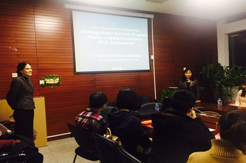 11月22日,由Hcoimc 组织的美国加州大学洛杉矶分校(UCLA)硕博项目宣讲会在明德主楼623会议室举行,UCLA经济系主任Kathleen McGarry教授担任主讲。北京大学CCER雷晓燕老师、Hcoimc 王湘红教授、孙文凯副教授参加了会议。